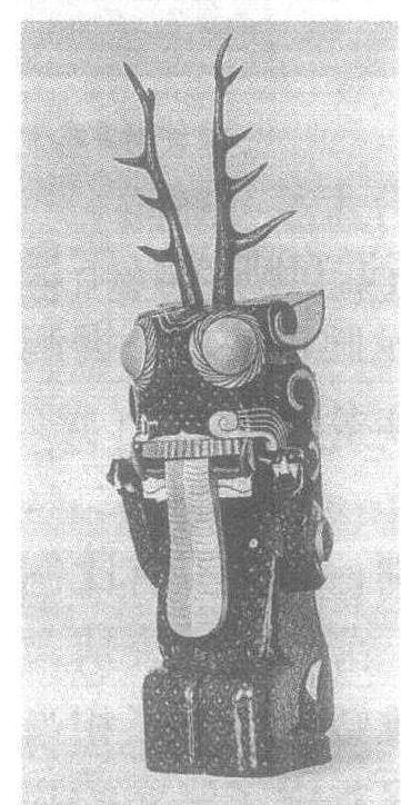 镇墓兽 现在见到的商周时代木雕不多,但从20世纪以来湖南、湖北、河南等楚墓出土的大量战国木雕、漆器推断,商周时期木雕艺术和青铜一样,亦有非凡的成就。 战国时期的木雕,基本都出自墓葬,也就是说,是作为明器为墓主人殉葬用的。它们大体有两类: 一类是木俑,以代替人殉 另一类是禽鸟兽类,有着逢凶化吉的作用。20世纪50年代末,河南信阳长台关楚墓里出土的木雕,大体包含了这两类木雕。 该墓出土的跪坐木俑有相当的写实功力,而木鼓器座和这件镇墓兽又极富装饰意味。兽高140厘米,由方、圆、长方等几何形体构成,为跪坐状。出土时头部已残,彩绘斑剥陆离。头硕大,占整身五分之三,上生两角,双目怒视,吐长舌,露獠牙,一副狰狞相,望之毛骨悚然。镇墓兽是墓主人的守护神,有驱邪逐魔之神力。出于这种特定功能的要求,作者以丰富的想像力、夸张变形的手法,创造了这一富有感染力的艺术形象。 |