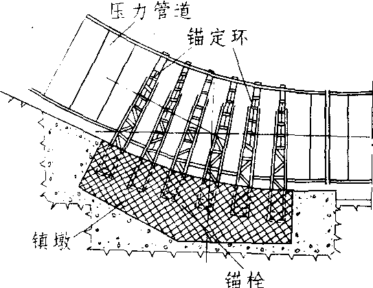 | 释义 | 镇墩anchor block设置在压力管道转弯处的混凝土结构物。其作用是固定管道,并承受因管道方向改变而产生的轴向力、法向力和弯矩(其中以轴向力为主),使管道在镇墩处不发生位移。其体积常决定于稳定要求,强度容易满足。按管道在镇墩上的固定方式,可分为封闭式和开敞式2种。前者管道包在镇墩内,结构简单,对管道锚固好,应用较多;后者用锚定环锚固管道,易于检修,但用钢材较多,造价高,且镇墩处管壁受力不均匀。
