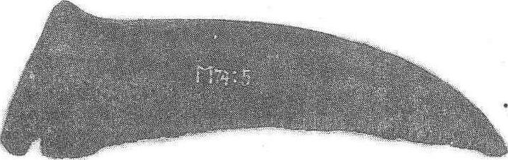图2 辽宁旅大郭家村出土蚌镰 作相当精致。商周时期出现青铜镰刀(见图3)。如江西新干大洋洲商代墓葬出土的几件铜镰,其形制已与战国西汉的铁镰相差不多,大致从战国开始,铁镰(见图4)逐渐取代铜镰。西汉以后,铜镰已基本消失。作