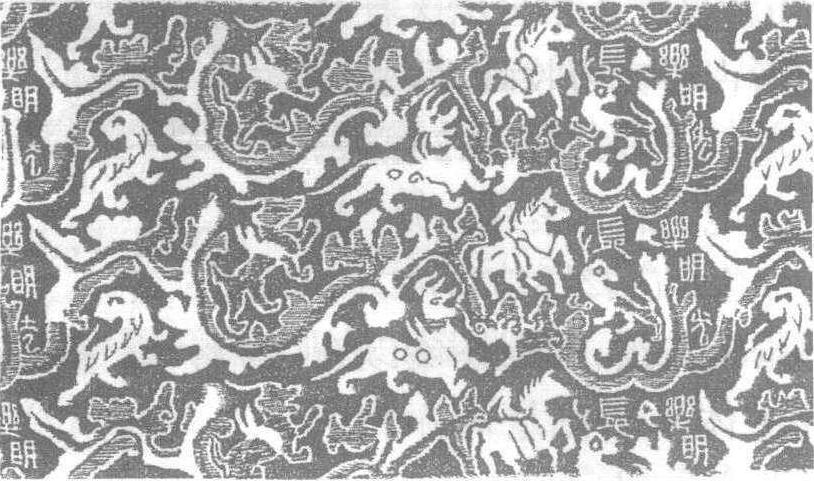 | 释义 | 长乐明光锦东汉制品,1980年在新疆罗布泊楼兰故城东7公里高台墓地二号墓中出土,现为新疆维吾尔自治区社会科学院考古研究所收藏。残长49厘米,宽10厘米。经线起花,以蓝色为地,上饰褐、绛、草绿三色显花,色彩浓重。图案中为骑马人物,左方为翼兽,右方为一狗,形象雄强。外缘有缭绕的变体云纹,右侧织出隶书体“长乐明光” 四字。汉代织锦较为发达,多采用祥禽瑞兽和吉祥文字装饰,与富于变幻的云纹构成具有强烈动感的画面。