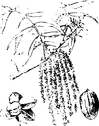 特征与特性 树高一般20~30米, 最高可达50米以上。树皮深裂, 黑褐色。芽具鳞片, 芽和嫩枝被短柔毛。奇数羽状复叶,有小叶9~17片。雄花葇荑花序3条一束,几乎无总梗,花药有毛;雌性穗状花序直立,有雌花2~10朵。坚果外有4棱总苞,坚果短圆形或长椭圆形, 表面光滑, 淡黄褐色, 具黑色粉末状斑痕。