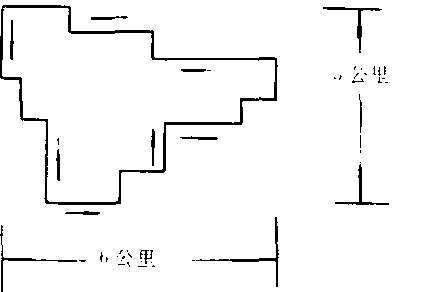 长方形面积=长×宽, 已知面积及一边长(长或宽)即可求得另一边的长(宽或长)。圆的周长=2π×半径, 已知圆心角及半径, 就可以求得圆弧的长度。这些是求长度的最基本方法。例1: 如图方框, 宽度为3厘米, 面积 (阴影部分) 为114平方厘米, 求方框外周长?解: 假定方框外部矩形长为a、宽为b(厘米),则方框面积为2a×3+2b×3-4×32平方厘米, 而方框的外周长为2(a+b), 于是2 (a+b) ×3-4×32=114, 2 (a+b) =50, 方框外周长为50厘米。例2:如图为某城市的长跑比赛路线,求沿此路线跑一圈的距离。解: 绕此路线跑一周, 从图中不难看出向东跑的各段距离之和与向西跑的各段距离之和均为6公里。同样,向南跑的各段距离之和与向北跑的各段距离之和均为5公里, 因此,一周的距离为22公里。例3:如图,长为4宽为3的长方形ABCD先以B为心顺时针旋转90°,再以C′为心顺时针旋转90°,求点A经过的距离。解: 第一次旋转点A经过以B为心的圆弧到达A′,第二次旋转A′经过以C′为心的圆弧到达A″,两圆弧的圆心角都是90°。但半径不同,圆弧AA′的半径是4, 而圆弧A′A″的半径是5关于角度计算,基本依据是❶平角角度是180°,周角角度是360°;❷三角形三个内角之和是180°。例4: 求如图七边形的内角和。解:如图示,用对角线把七边形分割为五个三角形, △ABG, △GBC,△GCD,△GDE和△GEF,七边形内角和等于这五个三角形内角的总和, 由于一个三角形内角和为180°,故七边形内角和为5×180°=900°。这一结论不难推广到n边形,当n≥3时,任意n边形内角和等于 (n-2) ×180°。例5:如图, 小圆O1内切于大圆O, 且圆O的半径是圆O1的4倍, 若小圆O1在大圆O内沿逆时针方向滚动一周回到原位, 那么对于固定的观察者而言,小圆O1转了几圈?解: 设在初始位置时, 圆O1上的点A落在圆O上, 由于圆O半径为圆O1的半径的4倍, 故当O1滚动一周时, A点有4次落在大圆O上, 这就是说, 相对于两圆的连心线,小圆沿顺时针方向转动了4周,但当小圆滚动时,连心线围绕O点沿逆时针方向转动了一周,这样,相对于圆外的固定观察者,小圆沿顺时针方向转动了3周。
