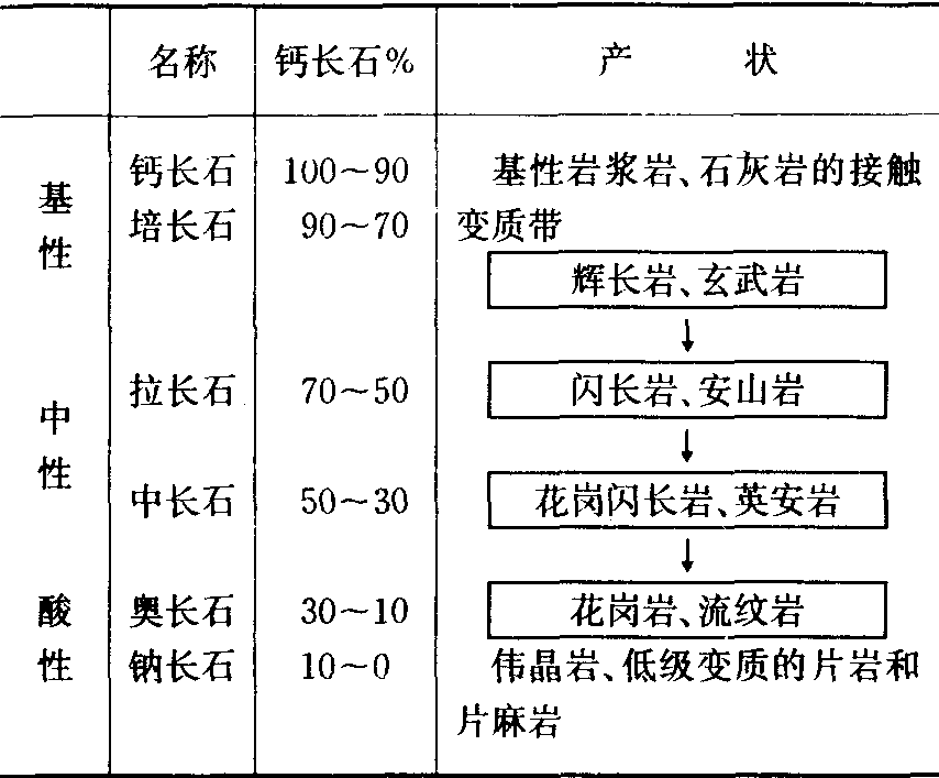 斜长石 由钙长石Ca [Al2Si2O8]和钠长石Na[AlSi3O8]组成的连续固溶体,全属三斜晶系。有两组互相以86°斜交的解理面。习惯上依两种组分的百分比划分为六种矿物。钠长石百分比高的斜长石含钾也多些。 斜长石分类