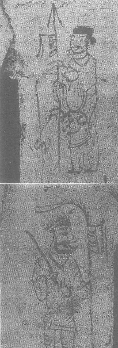 | 释义 | 门卫像壁画东汉前期。各纵105厘米,横50厘米。辽宁省金县营城子前牧城驿汉墓主室南壁壁画。1931年发掘。右侧的门卫头戴平巾帻,着圆领长衣,持戟而立,留有胡须,形象敦厚。左侧的门卫头发高竖,怒目圆睁,似在呵叱。他左手执旗杆,右手握长刀,具有勇猛威武之气。画面几乎无色彩,类似白描,以粗率的墨线描绘,似不经意,却简练传神,具有质朴雄浑的气息。