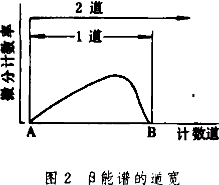 图 1 液体闪烁测量原理图 工作条件设置 有高压、放大倍数和道宽等设置。正确的仪器设置是获得准确测量数据所必需的条件。仪器出厂时,厂方提供3H和14C两个标准源;并给出测定时的各项工作条件和性能指标。校正仪器的性能指标,可按厂方提供标准源和条件。如果符合性能指标,则测3H或14C样品按厂方给定工作条件。若不符合或测其他放射性核素要适当调整工作条件。❶高压调整:其他工作条件按仪器说明书,用被测样品或标准源和本底瓶,高压从低到高改变,测定它们的计数率,并求出计数效率。再求出不同高压时品质因素(F=E2/B)。当品质因素为最大值时的高压为仪器的最佳高压。 ❷放大倍数调整:其他工作条件同上,对两个放大器的放大倍数在不同的组合下,测标准样品,并获得1道和2道的计数率。当它们的计数最大,又十分接近的放大倍数组合,为仪器较好放大倍数。 ❸道宽调整:其他条件同上。对于单标记同位素只作CPM测量,实际只设一道道宽。通常用被测样品的放射性核素能量在仪器全道中分成若干等分道,并测定各等分道的微分计数率。作出β的连续能谱。如图2所示。图中A、B分别是下甄别阈值和上甄别阈值。在A、B范围内几乎包括了被测样品的β能谱。这A、B之间的道数为道宽。这时1道作微分测量,2道道宽从A→∞作积分测量。若作单标记样品的绝对测量时,需作淬灭校正。这要设置1和2道道宽。设置方法同上。这样两道都要作微分测量。