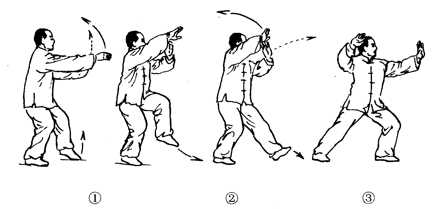 太极拳动作之一。吴式太极拳和老杨式太极拳称此式为“扇通臂”,孙式太极拳称此式为“三通背”,武式太极拳称此式为“三甬背”,其动作大同小异。此式多接于“海底针”动作之后。动作过程:❶两手交叉上举于前额上方,同时左脚后撤半步。(图2—4—49—❶)❷左脚向前迈出半步,脚跟着地。(图2—4—49—❷)❸右腿蹬地重心前移的同时,右掌上举;左掌向前推出。(图2—4—49—❸)动作要领:上体要中正自然,松腰沉胯;两臂肘关节要微屈;上架、推掌和弓步要同时完成。攻防含义:设乙方用右手迸击甲方头或胸部,甲方用右手刁拿其右手并向上引抬使其落空,随即进左步以左掌推击乙方右肋。若借乙方后撤之劲,则可将其发出。