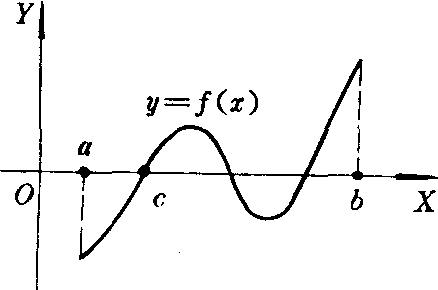 推论1 (根的存在性定理) 若函数f (x)在闭区间[a,b]上连续,且f (a) f (b)<0,则在区间 (a,b) 内至少存在一点c,使得f (c) = 0。 推论2 若函数f (x)在闭區间 [a,b]上连续,则f (x) 的值域为闭区间 [m,M],其中M,m分别为f (x)在 [a,b]上的最大值和最小值。 以上性质都具有明显的几何意义。如根的存在性定理的几何意义是,若点A (a ,f (a)) 与B (b,f (b))分别在X轴的上下两侧,则连结A,B的连续曲线y=f (x)与X轴至少有一个交点 (如上图)。 |