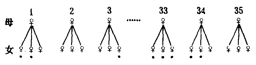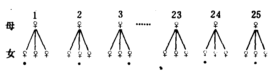 选择方式 分母女顶替和择优选留两种。❶母女顶替:种群组由25群蜜蜂组成时,只能采用此法进行选择。每只种王需培育至少3只处女王和大量雄蜂,在隔离随机自然交配或混精人工授精成功后,对各组子代蜂王(女儿)进行考察。根据考察的结果,从每组子代蜂王中各选出1只,以顶替原来的种王(母)(图1)。