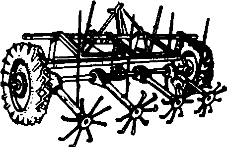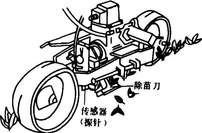 图1 旋转式间苗机 机械式间苗机是按刀齿运动的间隔距离来除苗和留苗。在除苗区段内无论苗株好坏,全部除去,在留苗区段即使无苗也不能稍作调整。因此,常出现留苗不均匀或缺苗段过长的现象。 传感式间苗机 用传感器控制工作部件进行间苗的机械。可以根据株距或幼苗的形态作出选择。按株距选择时,间苗机上的传感器测出与留下的前一棵幼苗相隔一定株距后出现的第一棵幼苗,并除掉这两棵幼苗之间的全部幼苗。可保证留苗数量。按植株大小选择时,传感器测出并保留隔一定株距后出现的较大的幼苗,除去其余的小苗,这样可保证留苗质量。传感式间苗机的传感器有电子传感与光电传感两种。 电子传感间苗机 一般由传感器、电子控制系统、传动部件与除苗部件组成。传感器为带电的探针,当探针接触到选留的幼苗时,利用叶子表面的导电性,接通连地电路,触发控制电路,使除苗部件工作。图2所示的间苗机,它以苗高为判别标准。探针的高度位置可按选留幼苗的高度进行调整。当探针与幼苗接触时,位于探针前方的除苗刀就除掉选留苗前的幼苗。