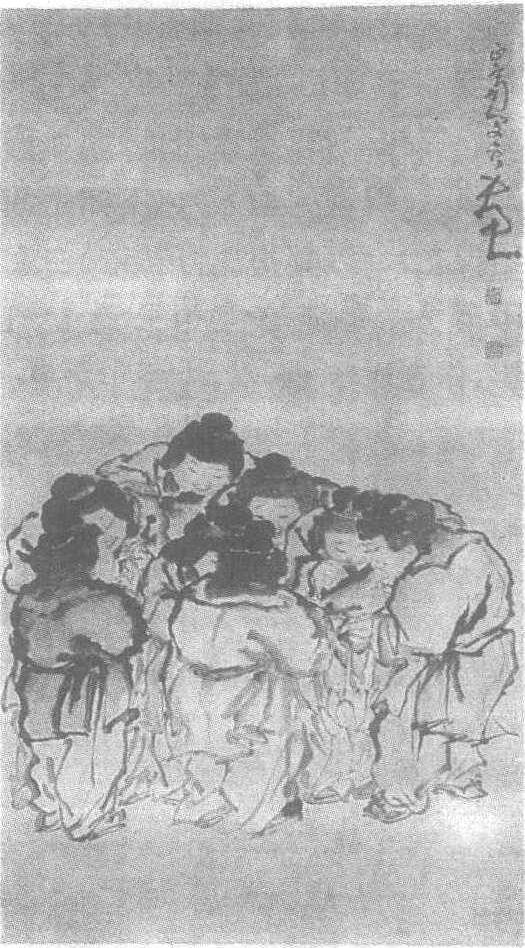 | 释义 | 闵贞八子观灯图轴清。闵贞(见《闵贞醉钟馗图轴》条目)绘。纸本设色。纵121厘米,横70.5厘米。江苏省扬州博物馆藏。此幅构图新颖,情趣盎然。画面上八个儿童紧紧地围聚在一起争看花灯,神态各不相同。最右边的一个手持一盏荷花灯侧身而立;她左边的那个儿童低头缩颈右手抬起,对着荷灯指指点点地正在赏玩;另三个儿童也围在花灯旁边,兴致颇高。画面左边的二个儿童没有加入他们的小圈子,背向的那个伸出胖胖的小手在向同伴讲述他见到的漂亮的花灯;他对面的小伙伴则津津有味的听着。最为生动的是在画面上部的一个孩童,他站在圈子的最外围,个子又小,看不见小伙伴们手中的花灯,于是右手搭在同伴的肩上,踮起脚,用力提高身子向前探。八个孩子都是矮矮的、胖胖的,脸儿都是圆圆的,额头上一排留海,头上一个小圆髻;细小的眉眼上翘的嘴角,神情专注而兴奋,显得天真可爱。整幅画以墨笔写意,面部以赭色淡染,头顶的圆髻用墨块点出;衣纹线条流畅,折转随意,富于动感;笔法纵逸,墨色浓润,姿态相异,各具神趣。