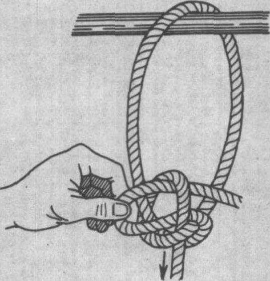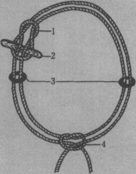 图 2 双套倒马法的套绳 单套法 需要2人。一人控制头颈,一人放马。❶保定绳的一端先套一铁环, 在颈基部作一绳圈, 用拴马结(图3)固定,把铁环放在颈部右侧,绳头从右前方通过腹下, 如双套法缠绕左后肢系部, 并作交叉。 ❷将绳头拉向右前方, 穿过铁环。此时保定人员握住绳头, 由骟畜右后侧转向左侧臀部, 用力牵拉绳头, 使骟畜呈左侧倒卧, 把左后肢蹄尖拉向右前肢肘部, 向外绞扭一绳圈予以固定。 ❸用双活结固定右后肢系部, 使蹄尖靠近右前肢肘头。