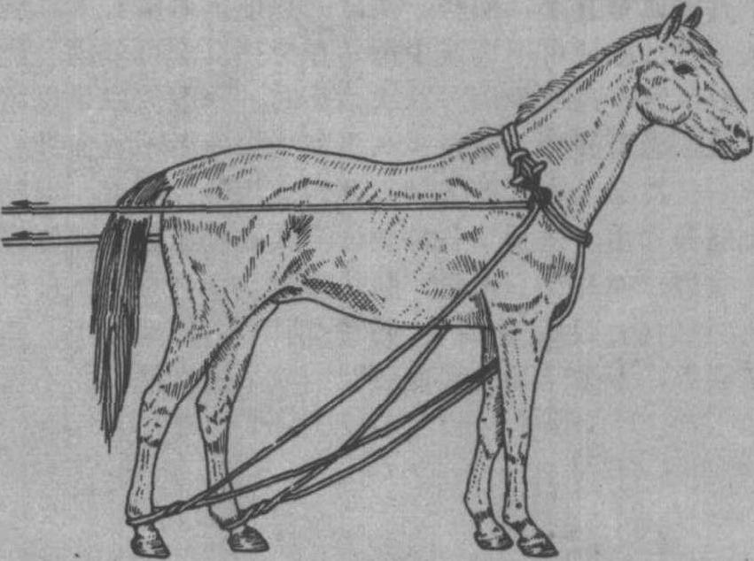 图 1 双套倒马法保定前的结扣 马骡保定法 双套法 需要3人。1人牵抓笼头,马体倒卧后固定头颈; 另2人抽拉保定绳, 放倒后捆缚马体。❶在保定绳的中部打结, 一端稍长、一端稍短, 并以双活结分别将两个绳环加以固定。然后向两边绳环上分别套一铁环。把两个绳环置骟畜左右侧颈部。穿棍交叉固定(图1)。 ❷将保定绳的游离端同时穿过两前肢和两后肢之间, 然后分别向外绕过同侧后肢系部, 并与同侧腹下绳绞扭一周, 以免系部绳滑脱。再把绳头穿过同侧颈部铁环。 ❸两侧保定人员各自向后牵拉同侧绳端(图2), 使骟畜以左或右侧躺卧姿势倒卧。倒卧后在牲畜头下垫以头垫并予固定。另2人再用力牵拉二绳头, 使两后肢的蹄尖接近两前肢的肘头部, 把右或左侧绳向外扭转一个绳圈, 套在两后肢的系部并予牵拉。打结固定在小木棍之上。,