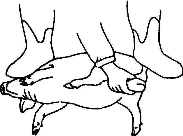 图6 猪倒吊保定法 公猪保定法 取左侧横卧保定。猪身背向术者,术者以左脚踩住颈部,右脚踩住尾根(图7)。此法适用于小公猪。