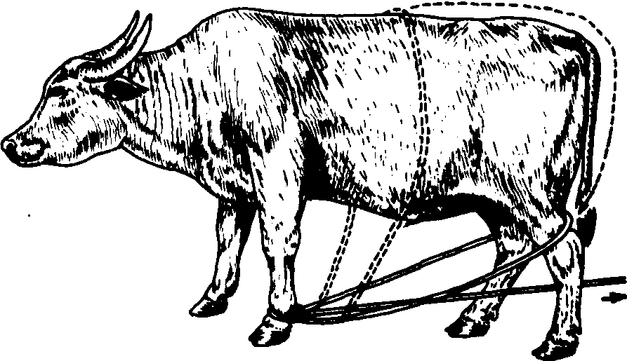 图3 拴马结 公牛保定法 站立保定法 适用于性情温驯的牛。由1人用牛鼻钳夹住或用手指握住鼻中隔及牛角,用绳子把牛尾拴在颈部。另外2人分别用背部靠紧牛的躯干两侧,两手分别握住同侧的耳和肷部下方的松软皮肤。 倒卧保定法 ❶用5米长的绳子1条,绳的一端拴一铁环,无铁环时可作一个小绳圈,先把有铁环或绳圈的一端拴到左侧前腿的寸腕上(即系部),再把绳由左向右通过胸下绕背部一周。 ❷将绳头穿过铁环或绳圈后,再把绳头向后从两后腿间拉出;然后把绕在背部的绳圈移到后腿的大腿部。 ❸当保定者向后用力牵拉绳头时,公牛左前腿和两后腿就因向腿下一齐靠拢而倒向主侧。为了避免牛只在放倒时损伤头部和角,应有1人控制头部,并于头下铺上头垫。 ❹牛只倒地后,用一条比较短的绳,在小腿部分别用活结捆住两前肢和两后肢,然后再把四条腿拉拢捆缚在一起(图4)。