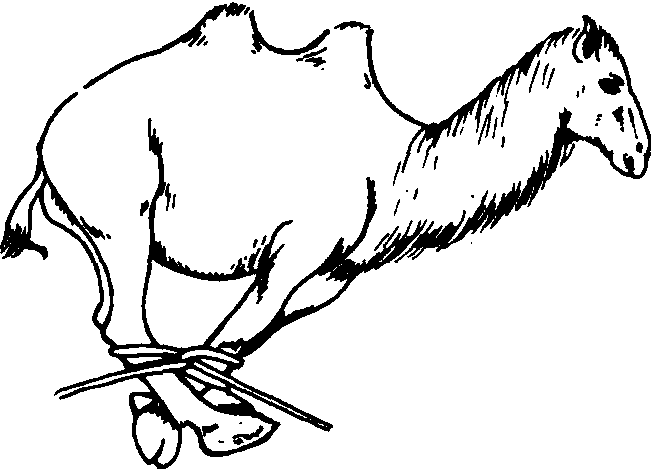 图4 牛倒卧保定法 公羊保定法 抱起法 适用于羔羊。助手抱起羔羊,背向保定人的腹部,腹向术者,头向上,臀向下,用两手分别握住同侧的前后肢。 倒提法 适用于小羊。助手以两手分别握住羊只的两后肢球节上方提起,两腿夹住羊只的颈部。 横卧法 适用于大羊。保定人员站在羊体左侧,两手绕羊背及右侧,分别握住二前肢和二后肢球节上方,并提举前后肢,使羊成左侧横卧姿势。用保定绳把四肢固定在一起。 公驼保定法 使驼伏卧。❶将6米长保定绳对折,置于骆驼左侧,使绳的对折端超过驼肩。 ❷1人站在其头部左前方,按压头部,使左侧横卧,2人在骆驼左侧用手按压驼峰。先向右侧推动,随即向左侧按压,使驼体左侧横卧。 ❸1人用力按压头部;另外2人,1人转向前肢前方,1人转向后肢后方,把两个绳头穿过肩头绳圈后,分别用力牵拉一个绳头,使四肢靠拢,打活结固定。再用2米长的保定绳,在四肢系部固定(图5)。