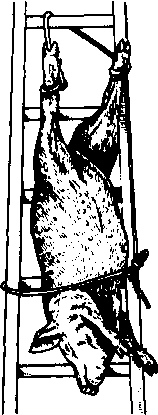 图5 公驼保定法 母猪小挑花阉割术保定法 术者站立或坐于小凳上,由助手握住小猪左后腿成倒立姿势交与术者。术者以左手握猪后腿,以右手握住左侧膝前皱襞,随即使猪右侧横卧于地。此时,猪头部在术者右侧,背向术者。术者随即用右脚掌压住猪颈左侧,将猪左后腿向后拉直。术者以左脚踩关节下缘处,使小猪呈头胸部侧卧,腹部半仰卧姿势。猪体的下颚、左侧膝前皱襞、膝盖构成一条直线。 母猪大挑花阉割术保定法横卧保定法 用一结实木棒压住母猪颈部,并用绳拴紧两后腿。也可由助手将母猪呈右侧(或左侧)横卧后,术者站在母猪的背外侧,并用右脚踩住母猪的颈侧面,两后肢由畜主保定并拉直。 倒吊保定法 适用于中小猪。取带铁环的绳索一根、梯子一把。先把绳索搭在梯子横柱上,使有铁环的一端在梯前,另一端在梯后。将母猪倒挂,使腹部朝前,背靠梯子。绳端穿过铁环,先套在猪左后腿的小腿上,将梯后绳端作一绞扭的圈套,套在右后肢的小腿上。然后用绳头拉向梯子下部捆缚住猪的胸部,打活结固定(图6)。