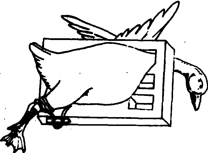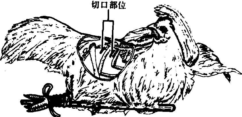 图9 公鸭保定法 公鸭保定法 将公鸭两翅左右交扭, 放于一特制的保定板上,使其颈项位于保定板左前侧的方孔内。用绳子将双脚固定于右下角(图9)。 |