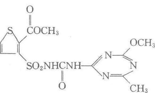 | 释义 | 阔叶散thiameturonmethyl又称噻磺隆,代号DPX—M6316。磺酰脲类内吸、选择性、超高效除草剂。化学名称:3-〔(4-甲氧基-6-甲基-1,3,5-三嗪基-2-基)氨基羰基氨基磺酰基〕-2-噻吩羧酸甲酯。化学结构式如下。原药为白色结晶体,熔点186℃,密度1.49,25℃时蒸气压36×10-5Pa。几乎不溶于常用有机溶剂中,微溶于pH6的水中。能被植物的叶、根吸收,在敏感植物体内抑制缬氨酸、亮氨酸和异亮氨酸的生物合成,阻止细胞分裂,生长停止而死亡。禾谷类作物有抗性,适用于小麦、大麦和玉米等作物,防除繁缕、猪殃殃、麦家公、播娘蒿、荠菜、猪毛菜、佛座、婆婆纳、春蓼、藜、苋等阔叶杂草。小麦、大麦二叶期到孕穗前,杂草出齐到二三叶期使用,使用量20~30 g/hm2(有效成分)。对人、畜低毒。大鼠急性口服LD50>5 000 mg/kg,兔急性经皮LD50>2 000 mg/kg。对眼有中度刺激,对鱼及水生动物低毒,对鸟类低毒。