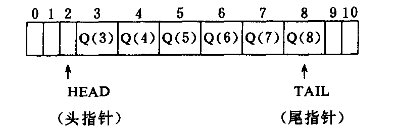 按i从小到大的顺序,头指针HEAD指向哪个元素,哪个元素就出队,比如现在要让排在前头的Q(3)出队,则需将头指针加1.即 HEAD=HEAD+1. 如果想让一个新元素入队,则需尾指针TAIL向增大方向移动一个位置. 即 TAIL=TAIL+1. 当队尾已经处在i最大的位置时,即TAIL=10,并不表示该队列已排满,因为队头指针不在i最小的位置上,也就是说队列元素还没有达到可能的最大值,这个最大值是由定义数组时规定好的. 如果队列的尾指针已达数组下标的上界,再让新元素入队,会发生溢出错误.队列在软件编程中应用广泛,凡是可以抽象为“先到先办” (即先进先出) 一类的处理过程,都可以用队列来模拟,比如操作系统中的作业排队,实时控制系统中缓冲区内的信息排队等. |
