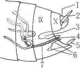 有翅昆虫雄性外生殖器基本构造 1.肛上板 2.尾须 3 .生殖腔 4.生殖孔 5.刺突 6. 阳茎 7.射精管 |