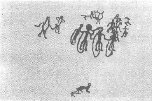 | 释义 | 阴山岩画连臂舞蹈图新石器时代。石壁敲凿。纵73厘米,横61厘米。位于内蒙古自治区磴口县西北托林沟附近一道山峡的石壁上。画面上是一个比较完整的舞蹈场面,分由几个场景构成:左边一组两个舞人,其一双手叉腰,系有尾饰。另一个则身披某种动物形象的服饰,手舞足蹈。这种模拟动物的舞蹈形式在原始民族中比较普遍,往往被作为狩猎活动的一个组成部分。画面的上方是一个带马拉弓的猎人,弓向上指,似乎表示欲射天上的飞鸟,弓弦拉得很开,成满月形,以至将人的上半身都遮住了,只露出了双腿。从其腿部弯曲、身体后仰的姿式看,显得格外用力。在右上角有三个表演者,其中一个仿佛是在马背上,双臂上举成环状。前后各有一人围着他跳舞。面画的中部一组四人联臂而舞,是画面的主体,舞者的身形较大,排成一队,腰间系有长长的尾带,右手将尾梢提起,形成四个带环,后面人的左手抓着前面人的右臂,有的人还带有头饰,他们动作一致、韵律和谐。舞蹈动作奇特,很能启发人们的想象力。整幅画面笔法简率,生动有趣。从内容上推测,这幅岩画应该是与狩猎相关的一次舞蹈活动或宗教活动的记录,有很高的学术价值,是研究原始社会史、民族学和舞蹈史的重要材料。