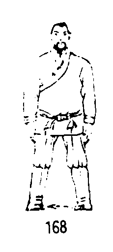 四十九式经络动功收功动作之一:两脚不动,两腿伸直,两掌轻轻垂于体侧;眼平视前方。(图168)要点:经过练功使体内的阴阳得到了调整,此时要意想自己的病有了好转。