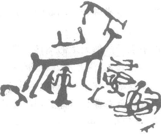 | 释义 | 乌兰察布岩画人羊图新石器时代至青铜时代。岩壁敲凿。纵39厘米,横45厘米。位于内蒙古自治区达茂联合旗百灵庙东北一岩石壁上。画面最重要的形象是一只山羊,翘首上望,一副悠然自得的样子,羊的躯干被大大夸张、拉长了。在它的腹下端立一人,羊的前面又有五个人排成两排,头向基本保持一致,横卧在地上,他们头上都留着两条发辫。岩画充满了神秘气息,宗教色彩很浓重,从其布局效果中,可以很明显地看出羊被神化了,它可能是司某种专职的神灵,也可能是被奉献的牺牲。而人的庄重姿态似乎表明他们正在举行某种仪式,也许正在为财富或种畜的繁衍而祈祷。此图在造型上十分简洁,形象的概念意味比较明显,人的造型仿佛是一个模子里印出来的,正在趋向符号化,对原始美术研究意义重大。