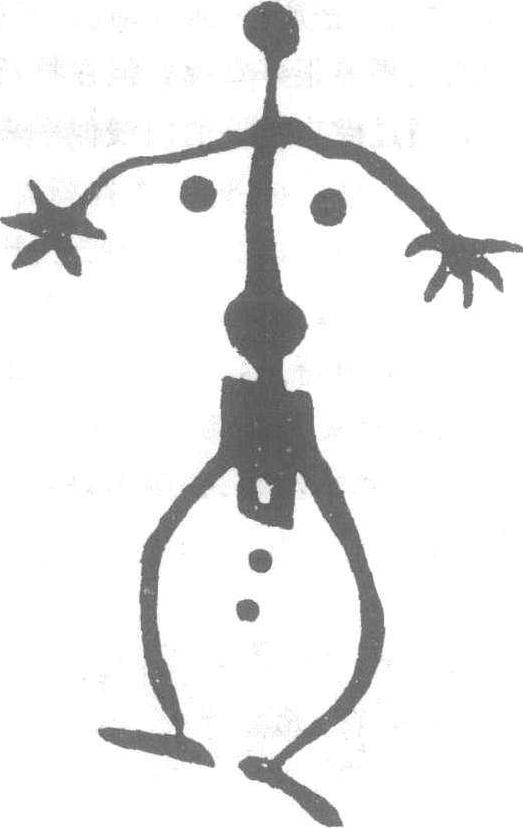 | 释义 | 乌兰察布岩画巫舞图新石器时代。崖壁敲凿,纵47厘米,横32厘米。位于内蒙古自治区达茂联合旗百灵庙东北一石崖上。画中一人裸身而舞,两臂向外舒展,五指张开,腋下各有一圆点,似是装饰物。两腿弯成弧形,脚趾朝向两侧,两腿之间似乎挂有某种饰物,下方又有两个圆点。舞者很可能是个巫师,抽象化的造型是这幅画的重要艺术特色,舞者身体由几条粗细线条表示,头部也只表现为一个大圆点。很像一个稻草人。舞蹈的动作很有意思,后世骑马民族舞蹈的某些舞姿似乎可以由此找到出处,因此它是舞蹈史研究的重要资料。