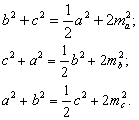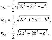 也称帕普斯定理.三角形三边与中线的关系:设a,b,c表示三边长,ma,mb,mc分别表示a,b,c三边上的中线长.则