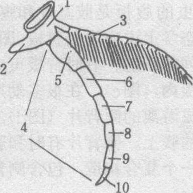 1.基肢节;2.基内叶;3.上肢节;4.端肢节;5.底肢节;6.坐肢节;7.股肢节;8.胫肢节;9.跗肢节;10.趾肢节 (仿R.E. Snodgrass)