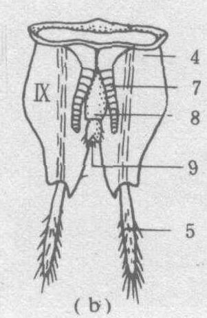 按各附肢所处体段,可分为头部附肢、胸部附肢和腹部附肢三类。 头部附肢 演变为感觉及取食器官,包括: ❶触角(据头部组成的六节学说); ❷上颚,为附肢的基肢节,端肢节已消失; ❸下颚和下唇,仍保留着原始基肢节与端肢节的构造。下颚的轴节、茎节与下唇的后颏、前颏同源于附肢的基肢节。下颚的内颚叶、外颚叶与下唇的中唇舌、侧唇舌同源于附肢的基内叶。下颚须、下唇须为附肢的端肢节。 胸部附肢 见胸足。 腹部附肢 一般包括行动器官,外生殖器和尾须。 在无翅亚纲中,缨尾目石蛃科第2~9腹节各有一对,包括一块位于腹侧面的肢基片(coxite)及其后端外侧着生的一根可活动的刺突,内侧有1~2个伸缩泡(图3)。刺突相当于附肢 的上肢节,用以支持腹部,可辅助行动。伸缩泡的来源尚不明确,雌虫第八、九腹节无伸缩泡,但在肢基片的内角有一根细长的生殖突,两节的4个生殖突合成一个产卵器(图4a)。生殖突可能代表基内叶或端肢节;雄虫第八、九腹节包括一个大的肢基片和一个刺突。阳茎是第九腹节后面的膜向外的突出物,不是附肢,而基部常围有一对生殖突(图4b)。弹尾目腹部有三对附肢,即粘管、握弹器和弹器,分别位于第一、三及第四或五节上。