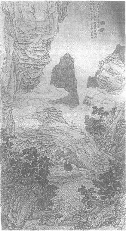 | 释义 | 陆治《云峰林谷图》纸本,设色。纵86厘米、横46.4厘米。现藏上海博物馆。此图描写云峰林谷间,一隐士静坐岩下泉水旁,观景听风。此画从构图到表现手法都很新颖。画面右半取一山峰崖壁下部,高不可测;画面中间,远景是 一高峰,近景是 一棚状崖体,隐士即坐其下。画面左侧为矮山,厚厚的白云缭绕山间,崖谷长满了绿树和花木。山石画法是先用淡墨勾轮廓和塑造体面,再用浓墨尖笔按结构提醒,浓墨线断续间点以重墨苔点。石体结构特别明确,效果强烈。