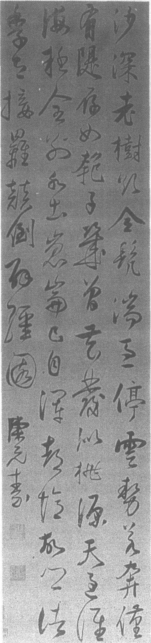 | 释义 | 陈元素行书七言律诗轴明。纸本。纵132.5厘米,横32厘米。上海博物馆藏。陈元素(见《陈元素草书五言律诗轴》条目)书。七言律诗:“沙深老树欲全髡,湍急停云势若奔。仅有隄存如匏子,几曾花发似桃源。天过淮海疑全别,水出昆仑已自浑。都忆故乡诸季在,接䍠颠倒辟强园。”款署“陈元素”。款下钤白文<陈元素印>、<古白>两印。行书得欧阳询之笔意,行草相间,笔画圆转遒美,内含筋骨,有秀逸姿媚之风格。