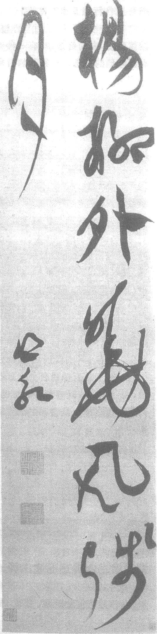 明。纸本。纵113.5厘米,横28.3厘米。北京故宫博物院藏。眭明永(?—清顺治二年,即公元?—1645年),字嵩年,江苏丹阳人。崇祯十五年(公元1642年)举人。为人放浪诗酒,常随意戏谑悲歌。工于画,亦擅楷书、草书。此幅草书,用笔温厚遒劲,结体纵横有势,甚得变化之趣。 释文:杨柳外晓风残月。明永。