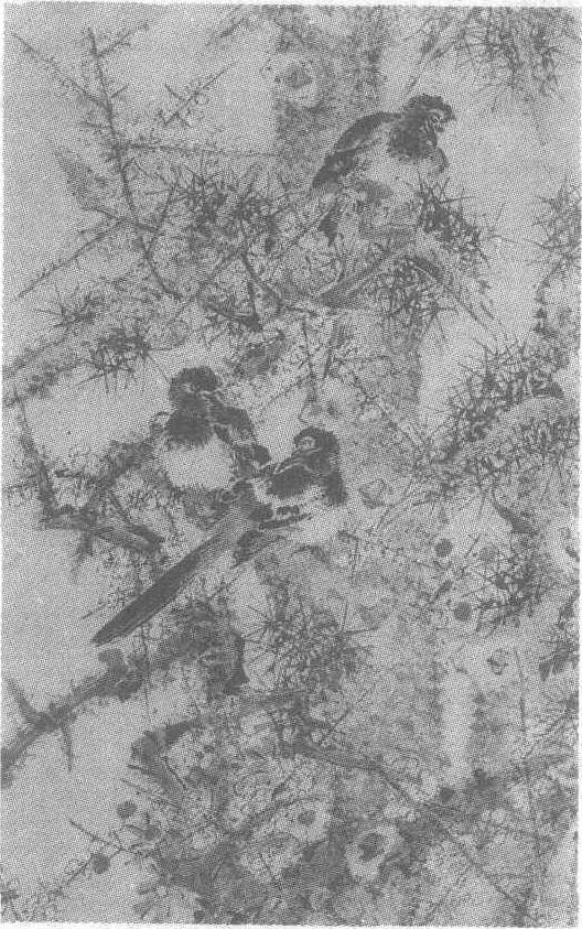 | 释义 | 陈嘉言松鹊双兔图轴清康熙九年(公元1670年)。陈嘉言绘。纸本设色。纵167厘米,横42.6厘米。上海博物馆藏。陈嘉言(公元1599—?年),字孔彰,浙江嘉兴人。他善写花鸟,运笔苍老自然,设色清丽,韵格兼胜,传世作品有《水仙梅雀图轴》、《梨花斑鸠图轴》、《松鼠葡萄扇页》及《野庭秋色扇页》等。此图描绘的是春暖花开,万物复苏时的动人一幕:绿茵茵的平坡兀石旁,两株巨松拔地而起,一高高耸立,一斜向画外。梅枝缀满怒绽的白花、含苞欲放的红蕾纵横交错,穿插在浓密墨绿的松针间。三只喜鹊栖立枝头,一只俯视前方,两只首尾相背地依偎在一起,喃喃细语。树下白、褐两只兔子斜对趴伏着,安静地咀嚼青草,尽情地享受着融融春光。轻柔的白云悠悠地浮过树梢,飘向远方。画的右上角有署款“仿元人笔意,七十二叟陈嘉言写。”下钤白文〈陈嘉言印〉、朱文〈孔彰〉两方印。此图集传统功力与独创于一体,布局平稳空灵,用笔苍劲老辣,墨色滋润。松柏劲健挺拔,梅花娇娆多姿,喜鹊毛绒可爱,双免宁和宜人。整个画面洋溢着浓郁的吉祥、平和、生机盎然的气氛,抒情性很强。