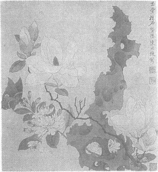 | 释义 | 陈洪绶杂画册明。陈洪绶(见《陈洪绶女仙图轴》条目)绘。绢本设色。纵30.2厘米,横25.1厘米。北京故宫博物院藏。此册作山水、人物、花卉等计八开。其一为设色花石:秀逸的湖石前后分傍一枝玉兰和一枝海棠。洁白的玉兰、粉红的海棠交相辉映,别具雅韵,仿佛散发着淡淡的清香。一只美丽的蝴蝶,扑闪着五彩斑斓的翅膀,轻盈地落在海棠绿叶上。图的右上角有题识“玉堂柱石,暨阳陈洪绶写。”下钤白文〈陈洪绶印〉、朱文〈章侯〉二方印。此外图上还有〈芝农秘玩〉等鉴藏印18方。其二为设色罗汉:坡石上,坐着一位额头高凸、络腮胡须满脸的罗汉,他怀抱手杖,正瞪大眼望着双手合十跪于其前、满头金色卷发的人。图的左上边有自题“无法可说,洪绶法名僧悔。”其旁有〈洪绶〉珠文联珠印。其三为设色石泉云树:矶石垒垒,芳草萋萋,流水跌荡,古树苍郁,洁白的浮云宛如玉带般横挂在远岫山腰、林木梢际。图的左下角有自题“老迟洪绶仿赵千里笔法”,下钤〈陈洪绶印〉。其四为设色黄河浪涛:一泻而下的黄河,汹涌澎湃,浊浪滚滚,咆哮着奔向远方。几叶扁舟随波逐流,漂荡在黄涛之间。河的两岸天低云黯,草木瑟瑟。图的右下角有自题:“黄河巨津,老迟洪绶。”下钤〈陈洪绶印〉。其五为设色仕女:一位手持纨扇的仕女,若有所思地走在前面,另有两位侍女手捧针线托盘和丝绣衣袍紧随其后,边走边轻声交谈。图的右上角有题识:“夔龙补衮图,陈洪绶书于静香居。”钤〈陈洪绶印〉、〈章侯〉二方印。其六为设色溪涧石桥:重峦叠嶂,气势雄浑的远山间,如流的瀑布蜿蜒地沿着山势倾下,汇入布满矶石的溪间,石桥上面相对坐着二人。图的右上角题:“溪石图,洪绶。”下钤〈陈洪绶〉、〈章侯〉二方印。其七为设色江渚归帆:暮色苍茫,晚风初起,在水上忙碌了一天的人们,在浅吟低唱的芦荻相伴下,落帆收缆,正慢慢地向港湾靠拢。掩映在茂密的树丛中的村落及远山披上了一层淡淡的轻雾。图的右上角有自题:“远浦归帆,仿赵大年笔意,老莲洪绶”,下钤“章侯”印。其八为设色湖山:近处江水浩渺,碧波荡漾。远处山岭逶迤,连绵起伏,洁白的小花,星星点点开满山崖。青山绿水间洋溢着浓浓的生机。图的左上角有题款“仿李唐笔意,洪绶。”下钤〈章侯〉印。此册画法工整,趣味古拙,设色浓淡相宜。山水、人物、花卉各具特色,无不精妙,堪称陈氏的佳作。