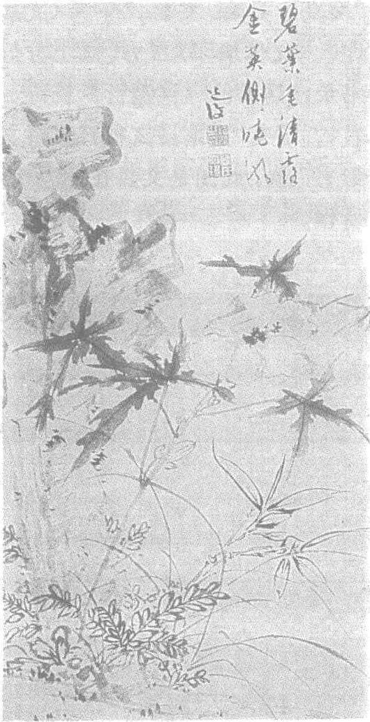 | 释义 | 陈淳葵石图轴明。陈淳(见《陈淳竹石菊花图轴》条目)绘。纸本水墨。纵68.6厘米,横33.8厘米。北京故宫博物院藏。此图画一枝秋葵,淡墨勾花,浓墨染叶,生韵盎然,形态逼真。秋葵后面衬以湖石,用飞白笔法,略施淡墨渲染。还画有竹枝和杂草,竹叶和草叶用浓墨双勾,笔力劲拔。随意点染,风韵万千,表现出了浓浓的秋意。构图别致,花卉写意,浅色淡墨,运笔自如,简洁洒落,风格劲健清爽,给人一种闲淡宁和的意境。画上自题诗句:“碧叶垂清露,金英侧晓风。道复。”钤白文〈陈淳之印〉、〈陈氏道复〉二印。借助于画中题诗,充分发挥了花鸟画抒情的作用,诗画呼应,别有情致。此图是陈淳中年精作。