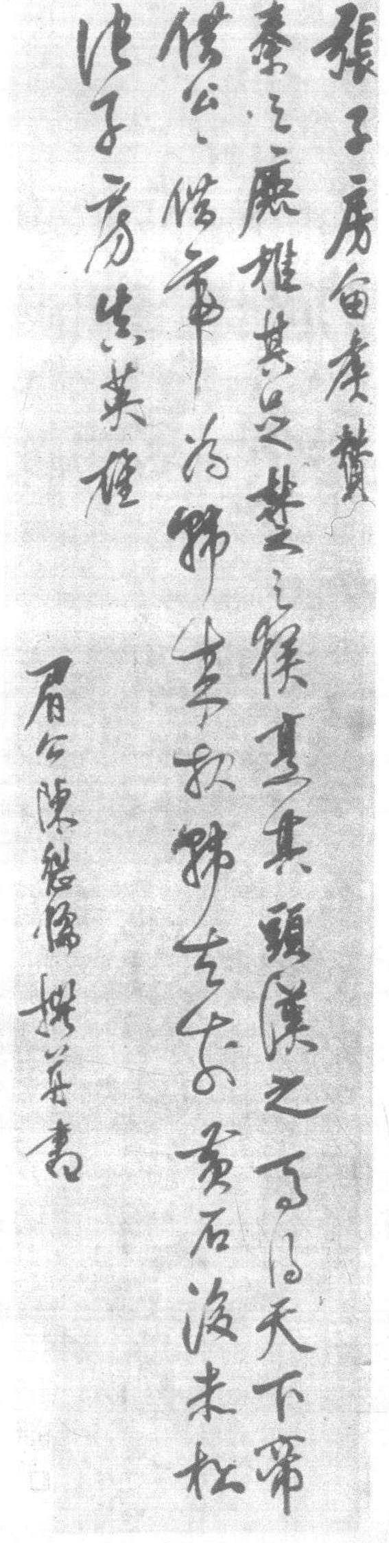 | 释义 | 陈继儒行书张子房留侯赞轴明。纸本。纵147.3厘米,横36.7厘米。江苏省南京博物院藏。陈继儒(明嘉靖三十七年—崇祯十二年,即公元1558—1639年),字仲醇,号眉公、麋公。华亭(今上海松江)人。居小昆山,自命隐士,后杜门著述,屡见诏,以疾辞。工诗文,诗词皆有风致,酷好东坡的诗词文章,善绘事,工鉴别、书法,书师从于苏、米。明陶宗仪《书史会要》云:“继儒书法苏长公,故于苏书虽断简残碑,必极搜采,手自摹刻之,曰《晚香堂帖》。”著有《陈眉公全集》,辑有《国朝名公诗选》、《宝颜堂秘笈》等。《明史》卷二百九十八有传。此行书自撰“张子房留侯赞”,将苏轼、米芾、黄庭坚的笔法融合一体而自成一面,笔法爽利、洒脱,字态摇曳多姿,以纵长取势,笔势流畅,上下左右顾盼呼应,气势雄健,布局于黑白虚实对比中显得错落有致,平衡稳定中见和谐。