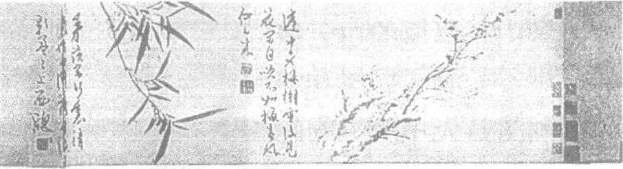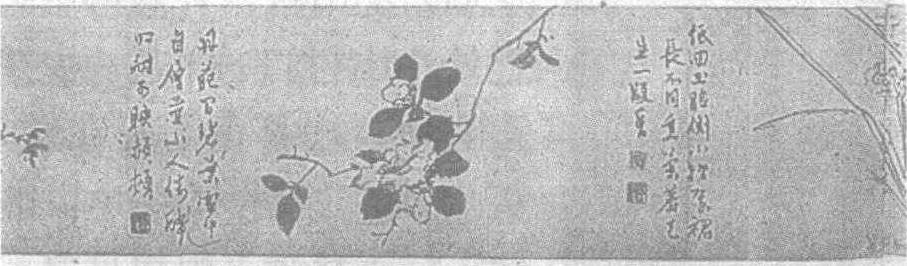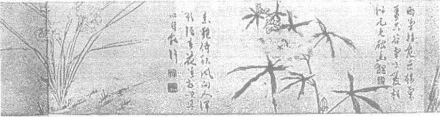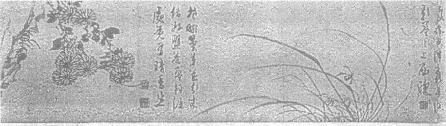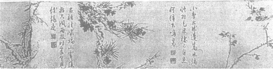 | 释义 | 陈道复《墨花钓艇图》纸本,墨笔。纵26.2厘米,横564.5厘米。现藏北京故宫博物院。写意画梅、竹、兰、菊、秋葵、水仙、荆榛小鸟、松、寒溪钓艇,每段自题五言绝句一首,并钤印记。诗书画印完美结合。墨花均为折枝局部,形象单纯,手法简逸,于不经意中显 严谨。画后自识: “余留城南凡数日,雪中戏作墨花数种,忽有湖上之兴,乃以钓艇续之,须知同归于幻耳。甲午(嘉靖十三年即1534年)冬白阳山人书于小南海。”