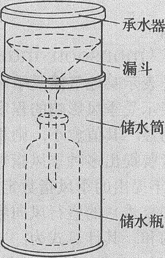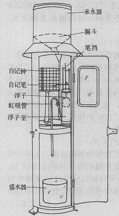 ![]() 图1 雨量器 虹吸雨量计能自记雨量并通过虹吸管自动排水的一种测雨量仪器(图2)。降雨时, 水从承水口漏斗进入浮子筒, 浮子通过直杆与自记笔杆相连, 当浮子升到顶端(一般相当于10毫米降水量), 筒内的水就由虹吸管排出, 这时笔尖就落到自记纸的零线上, 然后随着继续降水面又重新上升。自记曲线斜率的大小就表示降雨强度的大小。虹吸排水时间一般不应超过20秒。因在虹吸时间内的降水也同时被虹吸排出,而不能记录在纸上。故在降水强度大的情况下须进行虹吸订正, 即以虹吸时间乘以当时估计的 (或内插的) 降水强度。