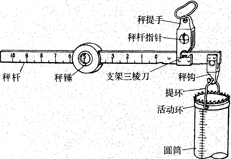 ![]() 图3 称雪器 称雪器 用来称雪的重量并测量雪压的仪器(图3)。它包括带盖的圆筒、秤和小铲。圆筒的截面积为50厘米2。取样时,将圆筒垂直插入雪中,直到地面。把小铲插到圆筒底沿下面,连同圆筒一起拿起。再将筒翻转,然后称量重量。因为秤杆上每一个刻度单位