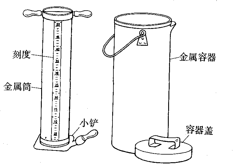 体积量雪器 用来量雪重并计量雪压的仪器(图4)。由一内截面为100厘米2的金属圆筒、小铲、带盖的金属容器和量杯组成。取样后将雪放入容器中,待雪融化后,用量杯测定其容量。雪压P=M/100(克/厘米2),M为样本重量(克)(见降水现象)。