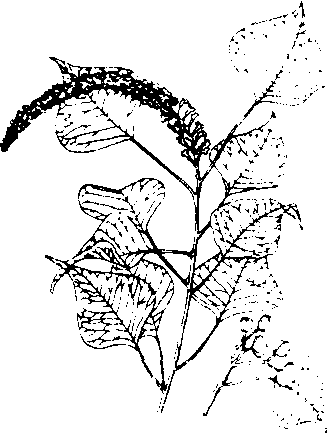 (b) 乌桕花粉粒 乌桕花粉粒长球形,赤道面观为椭圆形,极面观为3裂圆形。花粉大小35.3(31.5~39.7)×25(22.1~28.8)微米。具3孔沟,沟两端尖,中部较狭;内孔圆形或椭圆形,轮廓不明显。外壁两层较厚,表面具清楚的网状雕纹,网孔圆形,大小较均匀,孔大约1.1微米。(见图) 乌桕花粉中测定的17种氨基酸, 总含量约占16.272%。花粉含有6种维生素,其中维生素B6含量较高,为71.6毫克/100克。花粉中含有26.73%还原糖,10.88%果糖,11.11%葡萄糖。微量元素以锰、铬、钴含量较高。 乌桕花粉氨基酸含量(克/100克): 天冬氨酸1.988,苏氨酸0.694,丝氨酸0.776,谷氨酸1.887,脯氨酸1.721,甘氨酸0.816,丙氨酸0.988,半胱氨酸存在,缬氨酸0.998, 甲硫氨酸0.308, 异亮氨酸0.902,亮氨酸1.396,酪氨酸0.585,苯丙氨酸0.857,组氨酸0.550, 赖氨酸0.962, 精氨酸0.844,总计16.272;必需氨基酸6.117。 乌桕花粉维生素含量(毫克/100克):尼克酸8.4,维生素A原4. 1,尼克酰胺22.6,维生素B6 71. 6,维生素B1 6.1,维生素B2 2.7。 乌桕花粉微量元素含量:铁30,铝9,钙≥300,镁> 300,钡0. 6,铍<0.003,锰10,锆<0. 3,钛0.3,铅0. 09, 锡<0. 03, 镓<0. 03,铬0. 1,镍0. 09,钼≤0.03,钒0.09,铜0.9,鐿<0. 03,钇-,锌2,钴0.1,锶0.3,铋-,银<0.03,硼0.1,钠30,钾>300,磷300,硅300、硒0.002。 乌桕属约有120种,中国约有10种,其中山乌桕也是优良的蜜源植物。 乌桕Chinese tallow treeSapium sebife-rum,大戟科乌桕属落叶乔木。染色体数2n=88,36,80。高达15m,树冠圆球形或卵圆形。树皮灰褐色,浅纵裂。叶互生,菱状阔卵形至心状阔卵形,先端渐尖至尾尖,全缘;穗状花序顶生,长6~12cm,花单性同株,黄绿色,无花瓣,雌花着生于花序基部,花期5~7月;蒴果球形,种子被白色蜡层,10~11月果熟。产中国长江流域及以南地区,黄河流域以南皆有栽培;日本、印度也有分布。喜光,喜温暖湿润气候和肥沃土壤,在含盐量0.3%的盐碱土上也能生长良好,较抗旱,耐水湿。生长速度中等,寿命可达80年以上。深根性,抗风力强,不易着火;对二氧化硫及氯化氢等抗性较强。在黄河流域及高海拔地区,秋梢易受冻。主要以种子繁殖,优良品种用嫁接繁殖。病虫害主要有刺蛾、大蓑蛾及樗蚕等。 乌桕Chinese sapiumSapium sebiferum (L.)Roxb.,又称木蜡树。大戟科,乌桕属。落叶乔木。高达20 m。叶菱形或菱状卵形,长5~9 cm,先端尾状渐尖,基部楔形,秋季叶常变红色。花单性,雌雄花生于同一花序;雄花常3朵,成小聚伞花序,总状排列于花序上部,雌花1~4朵生于花序下部;无花瓣。蒴果扁球形。种子近球形,外被白蜡。分布于中国秦岭、淮河流域以南至华南及西南,浙江为重点产区;日本、印度、美国有引种栽培。喜光。宜深厚肥沃土壤。种子外面的桕蜡供制蜡纸、蜡烛;种仁榨取桕油,供制油漆、油墨、润滑油用。木材致密,供雕刻、家具等用材。花期长,为蜜源植物。