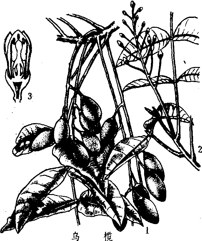 1. 果枝: 2. 花枝: 3. 花 对气温的反应较橄榄敏感, 主产区在24°N以南, 年平均气温22℃, 降水量1500~2000毫米。气温下降至-1.8℃,连续几天出现霜冻,枝叶会受冻害。年平均气温20℃左右,绝对最低气温-4℃以下, 1月平均气温10℃左右的地区少有分布。对土壤要求不严,土层较深厚, 疏松、湿润、肥力中等、排水良好的丘陵山地、河滩等都可良好生长, pH以4.5~5为宜。 主要品种 品种品系繁多, 仅粤中、粤东等地农家品种品系有100多个。❶西山榄。广东增城西山最早栽种。果重约10克, 肉质一般, 果肉占果实63%, 含油量45%,种仁充实,出仁率高。10月下旬采收。 ❷油榄。广东普宁栽培。单果重约9克, 核细,肉质嫩滑,味甘香品质优耐贮运, 果肉占果实71%,含油量47%。10月上旬成熟。 ❸秋乌。产增城, 番禺。果核小, 肉质嫩滑,有香味,早熟, 8月上旬至9月下旬采收。 ❹秧地头。产增城、番禺。单果重11克, 肉质较粗, 果肉占果实59%,含油量51%。中秋前后采收。 ❺车心榄。产广东普宁。肉薄质嫩滑, 有香味, 品质优。10月上旬成熟。 ❻鹅膏榄。产增城及广州市郊, 肉厚, 质极嫩滑, 有鹅膏香味。8月上旬至9月下旬成熟。 栽培技术要点 一般用本砧实生大苗嫁接。果充分成熟时, 用50~60℃温水浸果20分钟, 剥去果肉取核洗净晾干,沙藏。1月上旬播种, 播前用75~80℃热水浸种半分钟, 再用冷水浸2~3小时, 然后点播或条播。点播株行距18厘米×25厘米,真叶长出后补苗、移疏,尽量保全主根, 大苗移植以次年4月至6月为佳。小苗用补片芽接或切接,大苗用劈接,于3月下旬至4月上旬已抽花穗但未开花时, 嫁接最佳。 3月至4月定植, 株行距7~10米, 植前剪除大部分叶片和损伤的根, 将主根周围泥土压实, 树干用稻草包扎。幼树于2、4、8、10月各施肥一次,结果树于开花前、采果后各施肥一次, 也有在11月至12月增施一次过寒肥。注意水土保持、深翻压青以改良土壤。果实增大期久旱会引起落果, 应行浅中耕、土壤覆盖或淋水。地下水位较高的果园, 春夏季注意排水。 主要病虫害有: ❶树瘿病。为害树干或枝条, 被害部位呈瘤状突起,多发生于衰弱树,尚未有较好的根治措施。 ❷天牛。幼虫为害树干,在5、6月捕杀成虫,刮除虫卵,或用敌敌畏注入虫孔毒杀幼虫。 ❸叶蝉。早稻收获后, 叶蝉飞迁乌榄树新梢吸汁为害, 可用叶蝉散、马拉硫磷喷杀。 经济价值 乌榄加工成榄角、榄胚等佐膳小菜或凉果。核质坚硬细致,可雕刻成玲珑别致的工艺品,也可制成活性炭。核仁是饼饵佳肴的名贵配料。榄肉含油35~51%, 核仁含油45%, 均可食用。木材坚韧可制家具。是绿化荒山良好树种。 乌榄black canary treeCanarium pimela Koenig,橄榄科,橄榄属。常绿乔木。原产中国华南,主产广东省。羽状复叶有小叶15~21片,背面平滑。花期较早,花序长于叶。果熟时紫黑色,卵形至椭圆形,果核较长大。有不少农家品种。因抗寒力不及橄榄,栽培范围受到限制。