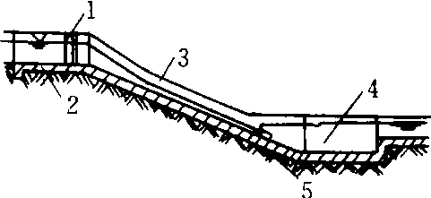 陡坡 1.进口 2. 护底 3. 槽身(陡坡段) 4.出口(消力池) 5. 槽身 |