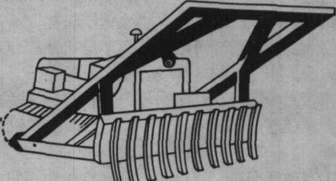 图1 推齿式除根机 杠杆式除根机 由带挖根齿的工作头、弧形架、提升油缸和工作头回转油缸组成(图2)。挖根时,在距树桩1~1.5米处通过油缸将工作头放下,使挖根齿插入树根下面。入土深度可达50~60厘米。机器停止向前开动,使工作头回转油缸动作,工作头绕弧形架前端的铰链回转,挖根齿向上掘起,将根挖出。这时挖根力通过弧形架下部的支撑掌传至地面上。当主根挖松时,通过提升油缸将工作头提起,同时机器向前开动,将树根推离根穴。当挖除较小的树根时,也可按推齿式除根机的工作方式作业,机器不需停下来。其优点是挖根力大,拖拉机受冲击载荷较小。