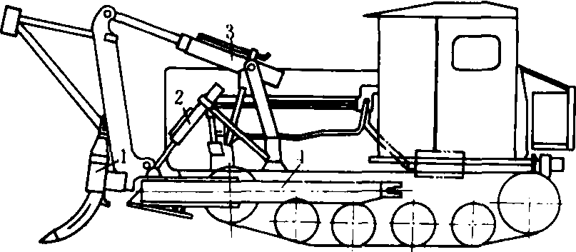 图2 杠杆式除根机 1. 工作头; 2. 提升油缸; 3. 工作头回转油缸;4. 孤形架 拉拔式挖根机 悬挂在拖拉机的后方,靠拖拉机的牵引力拔除树根。工作部件的型式有挖根齿式、夹钳式和掘根铲式等。挖根齿通常为1~4个,工作时插入树根下,拖拉机向前开动,将树根拔出。夹钳能夹紧树桩,靠拖拉机的拉力拔出树根。掘根铲则能深入到40~90厘米处,将树根切断,再将其挖除。拉拔式除根机的除根力受拖拉机牵引力的限制。当一次挖不出树根时,行走部分打滑会破坏土壤结构,同时影响底盘及行走部分寿命。