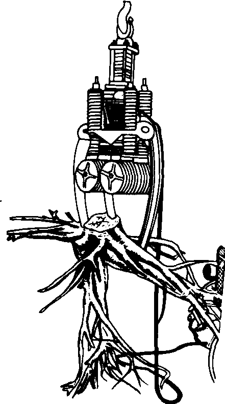图3 振动式除根机 振动式除根机 利用振动原理使树根与土壤分离。工作部件由抓紧装置和振动器组成,装在装载机吊臂上,如图3。工作时先由抓紧装置抓紧树的根部,通过液压或电力驱动的振动器产生振动,使根系与土壤分离,然后由吊臂将树根吊出。其优点是减少挖根阻力,不需要清除粘结在根系之间的土壤,对土壤结构破坏少,挖根后留下的根穴也小。如果配上挂车,还可以直接装车。有的振动式除根机在抓紧机构两侧增设拔根油缸。拔根油缸支撑在地面上,当抓紧机构抓住树根后,先在拔根油缸的作用下将树根拔出,再启动振动器将粘结在根上的土壤抖掉。拔根力不由拖拉机底盘承担。 |