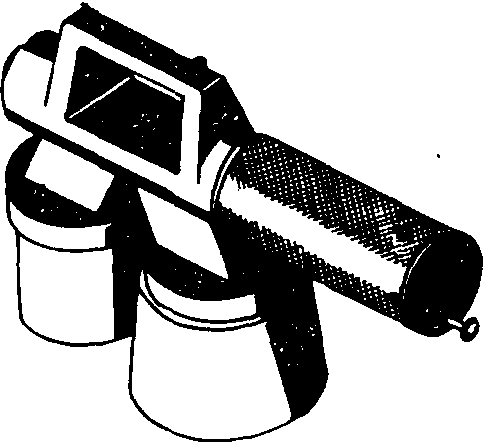 有两类:一类是利用热源将含有化学治螨物的药液通过喷雾器变为0.5~0.8微米的雾粒,气雾温度36~38℃,将气雾从巢门口喷入蜂箱内治螨,蜂箱底板上放承螨纸(或承螨板),收集落下的死螨。西欧各国多采用这种喷雾器,型式多样,主要有:❶以液化汽为热源的手提式除螨器(图1)。上部带有药液泵按钮的手柄,前端是圆柱形网状金属防护罩(内装有燃烧炉、蛇形管道),手柄下部前面有贮药液灌,后面有贮可燃性液化汽罐。手柄后端有液化汽调节阀。使用时,先打开液化汽调节阀,点燃燃烧炉中的液化汽,预热两分钟后,按压药液泵按钮,药液由贮药液罐流向蛇形管道。蛇形管道包于燃烧炉之外,药液在蛇形管道中受热汽化,从喷咀喷出。这种除螨器可直接握在手中操作,不需通电,但必须有微型液化汽罐与之配套使用。