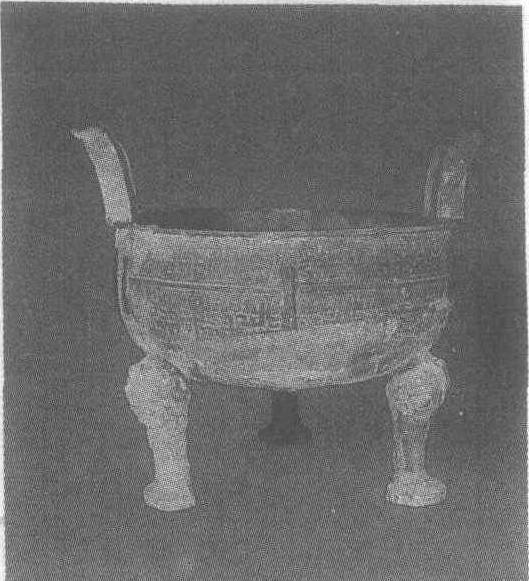 春秋。炊器,礼器。高52厘米,口径51厘米。传新郑盗掘出土。台北历史博物馆藏。圆形,口沿上一对立耳外翻,腹下有三兽腿状足。腹中有凸起绳纹一周和六直棱,满饰蟠夔纹。足饰饕餮纹。此鼎为春秋中期遗物。